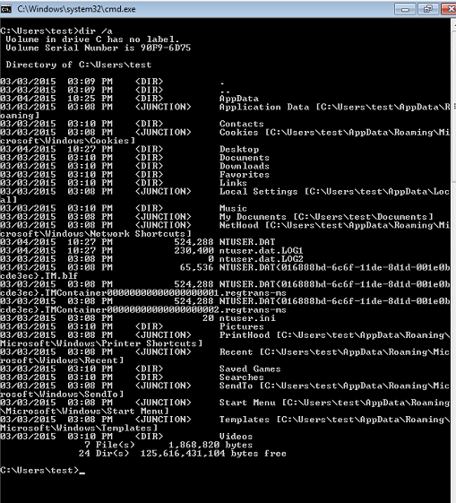 As you can see, the AppData folder isn’t showing up. This is because it is a hidden system folder. To see it, we can do a “dir /a”
