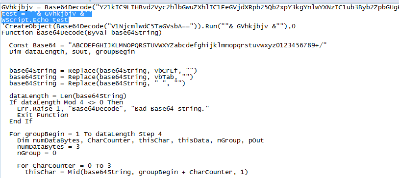 As you can see, the payload contains powershell.exe and an encoded string. To get more info on the payload, we can decode the string: