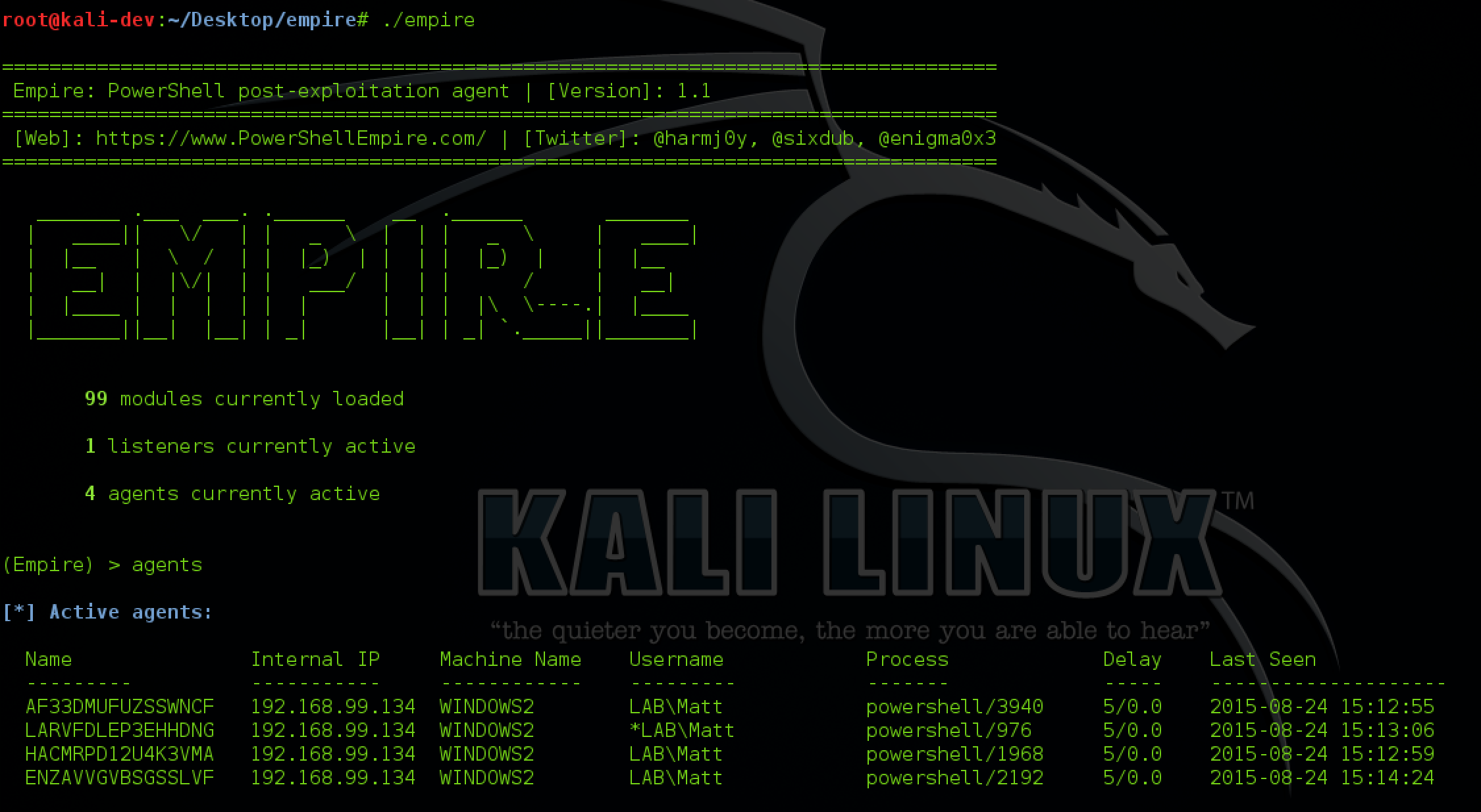 Sometimes, things don’t always go your way. In the event of an Empire crash on the server side, you won’t lose all of your access. The agents will run in memory on the target and will keep calling home, even if your listeners are down. Empire utilizes a backend database that preserves Empire’s configuration (such as listeners). In the event of a crash, simply start empire back up and wait for your agents to check back in: