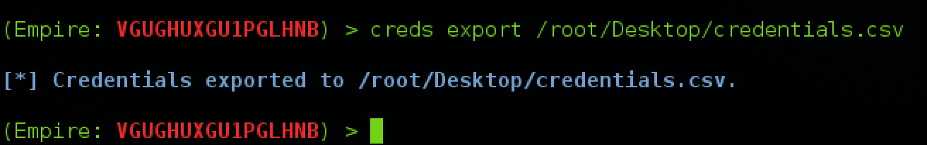 Empire also allows you to export the credential store to a CSV. You can achieve this by typing “creds export <filePath>\file.csv”: