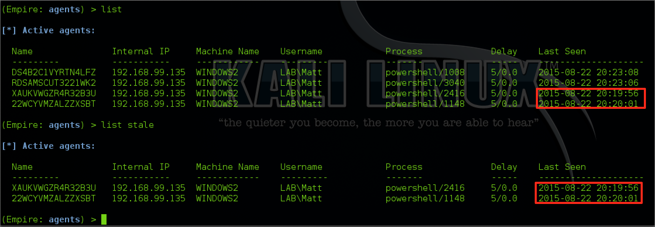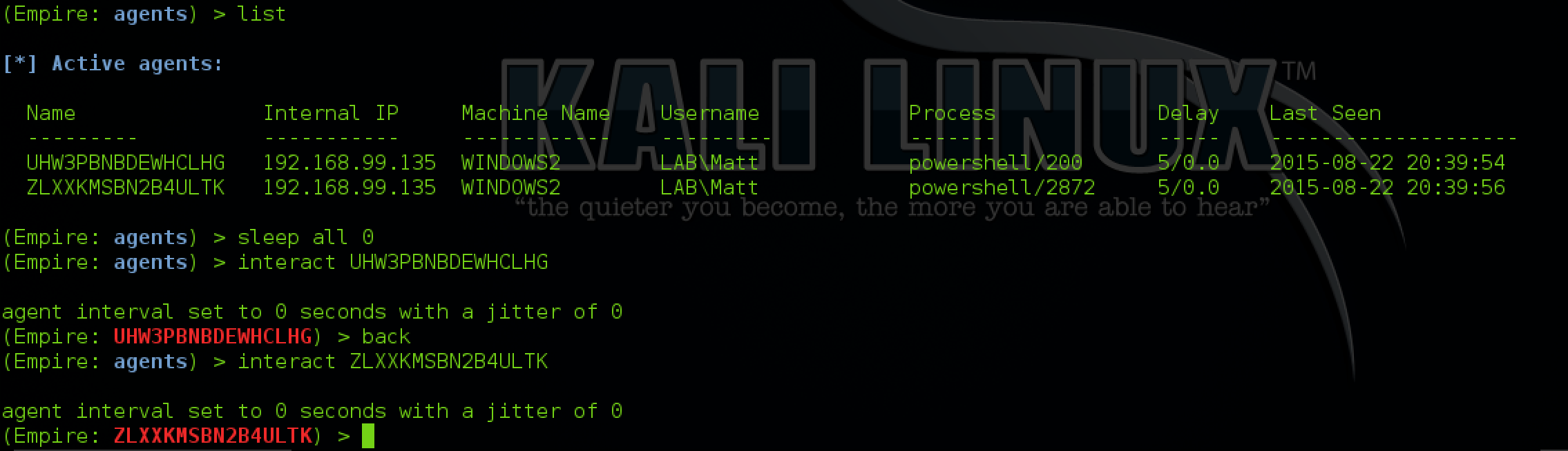 You can also list any agents that haven’t checked in in a period of time by typing “list x”. X will be the minute window for the agent check-in. For example, “list 5” will list all agents that have called back in the last 5 minutes.