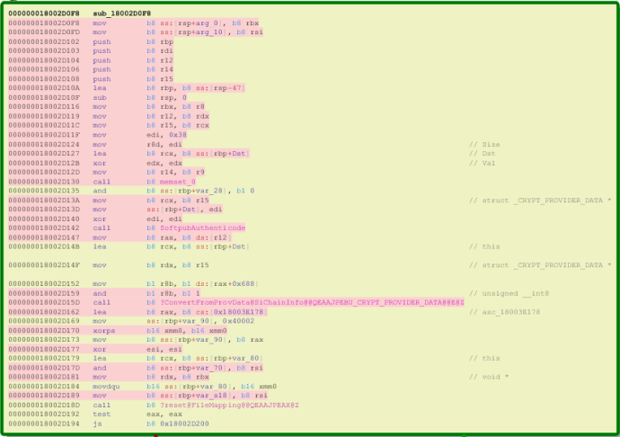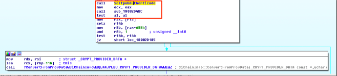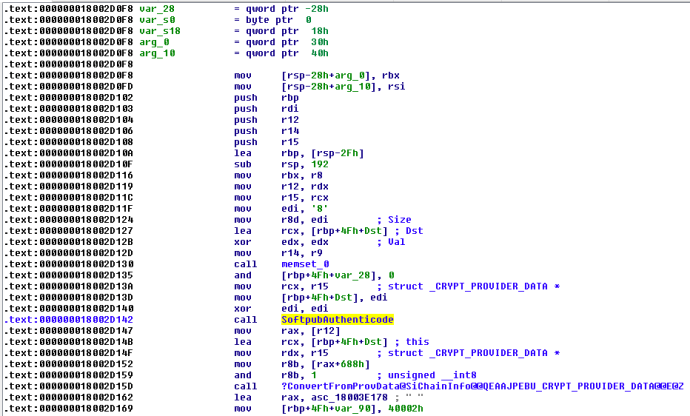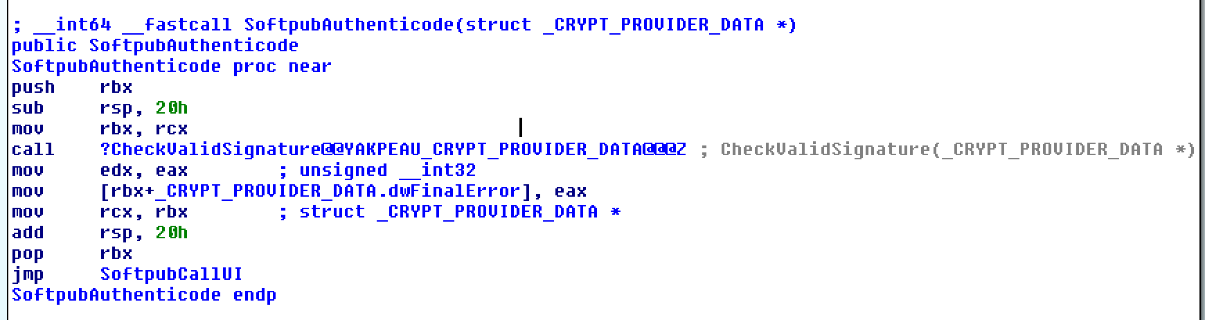 Looking at “SoftpubAuthenticode” reveals that it calls another function named “CheckValidSignature”: