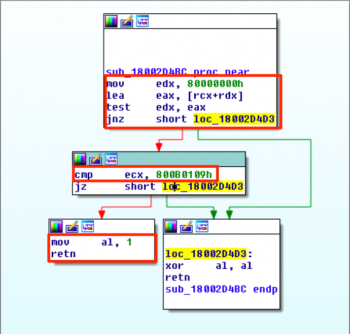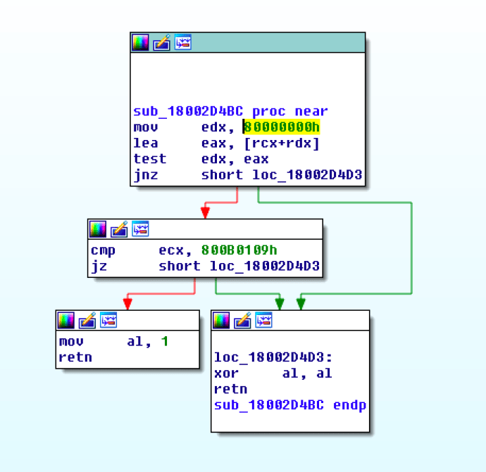 This function returns a BOOL (0 or 1), depending on the result of operations performed on our error code. This addition checks to see if the call to “SoftpubAuthenticode” succeeded (< 0x7FFFFFFF) or if the return code matches “0x800B0109”, which translates to “CERT_E_UNTRUSTEDROOT”. In this case, SoftpubAuthenticode returned 0x80096010 (TRUST_E_BAD_DIGEST) which does not match either of the described conditions, resulting in the function returning 1 (TRUE).