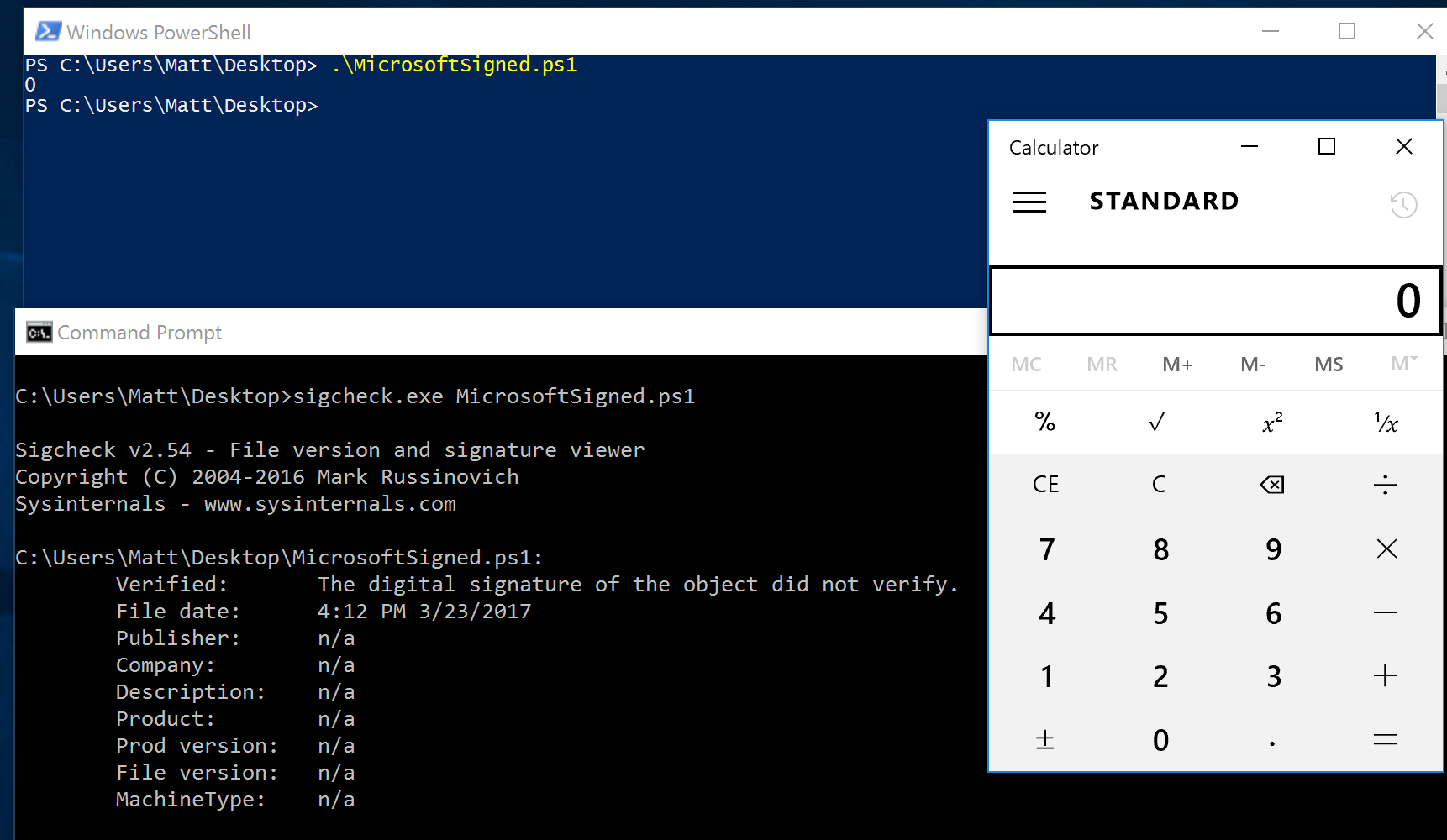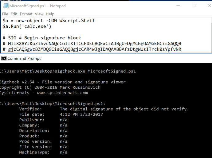 As you can see, the original contents of the script were replaced with our own code, and sigcheck reports that “The digital signature of the object did not verify”, meaning the integrity of the file has been compromised and the code will be blocked from running, right?