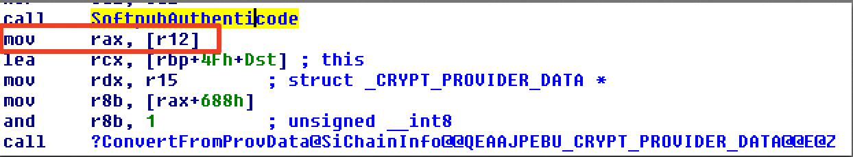 Since our error code is stored in eax, it gets overwritten immediately after returning from SoftpubAuthenticode via “move rax, [r12]”.
