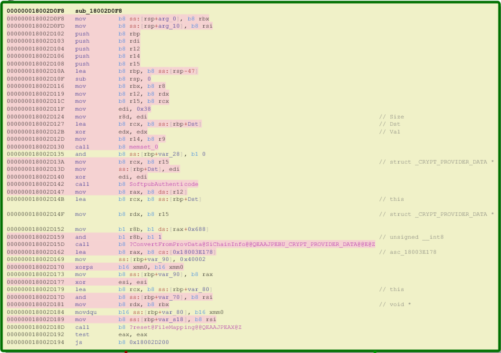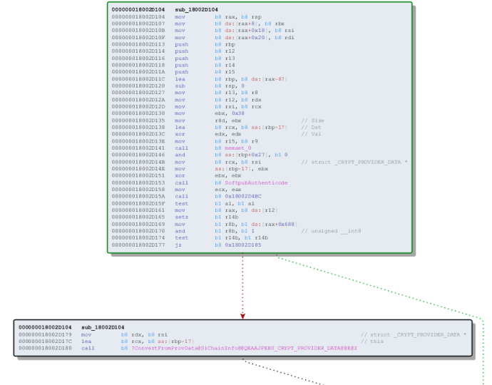The text above is a bit small, but I will go into depth on what exactly was done. I won’t go into specifics on using bindiff, but if you want to learn more I recommend you check out the manual. Armed with the general location of the bug fix, I set out to identify exactly what was happening when our unsigned code was executed. Knowing that some code was removed from “sub_18002D0F8” and added to a new block named “sub_18002D104” made these two places a good starting point. First, I opened up the pre-patch version of wintrust.dll (10.0.14393.0) in IDA, and navigated to the sub that was modified in the patch (sub_18002D0F8). This function starts off by setting a few variables and then calls “SoftpubAuthenticode”