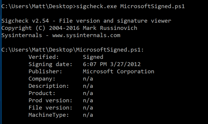 Fortunately, Microsoft has scripts that are signed with their code signing certificate. You can validate that a script is indeed signed by Microsoft using sigcheck or the PowerShell cmdlet “Get-AuthenticodeSignature”. In this case, I grabbed a signed PowerShell script from the Windows SDK and renamed it to “MicrosoftSigned.ps1”: