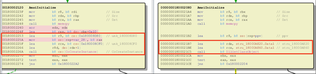On the left, we have the old AMSI DLL and on the right, we have the newly updated AMSI DLL. As you can see, Microsoft appears to have removed the call to CoCreateInstance() and replaced it with a direct call to DllGetClassObject(). CoCreateInstance() can be defined as a high-level function used to instantiate COM objects that is implemented using CoGetClassObject(). After resolution finishes (partially via registry CLSID lookups) and the COM server is located, the server’s exported function “DllGetClassObject()” is called. By replacing CoCreateInstance with a direct call to amsi.dll’s DllGetClassObject() function, the registry resolution is avoided. Since AMSI is no longer querying the CLSID in the registry for the COM server, we are no longer able to hijack it.
