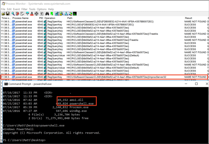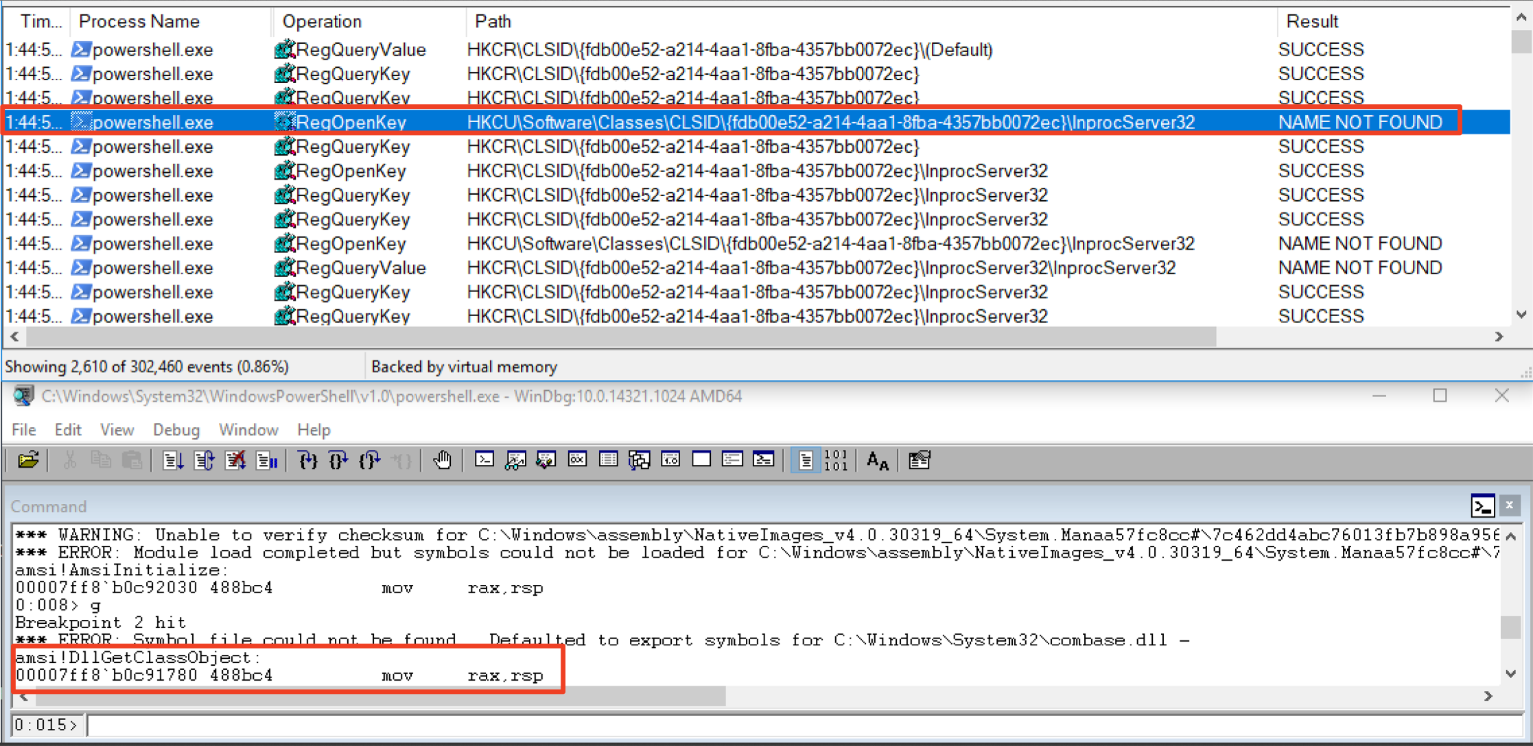 Next, we drop the vulnerable AMSI DLL and move PowerShell to the same directory. As you can see, it is now querying the registry to locate AMSI’s COM server: