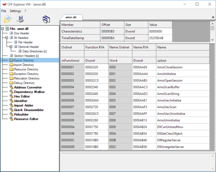 That begs the question: how does this work? Looking at the exports of amsi.dll, you can see the various function calls that AMSI exports: