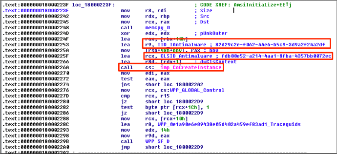 Looking in IDA, we can see the COM Interface ID (IID) and ClassID (CLSID) being passed to CoCreateInstance():