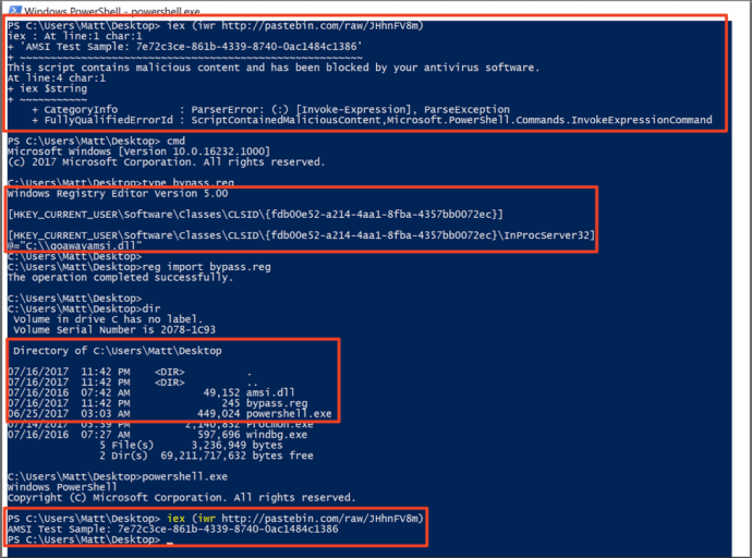 Now that we know the fix, how do we go about bypassing it? Before proceeding, it is important to understand that this particular bug has been publicized and talked about since 2016. Essentially, scripting interpreters, such as PowerShell, load amsi.dll from the working directory instead of loading it from a safe path such as System32. Due to this, we can copy PowerShell.exe to a directory we can write to and bring back the vulnerable version of amsi.dll. At this point, we can either hijack the DLL off the bat, or we can create our same registry keys to hijack AMSI’s COM component. Since this vulnerable AMSI version still calls CoCreateInstance(), we can hijack the registry search order again.