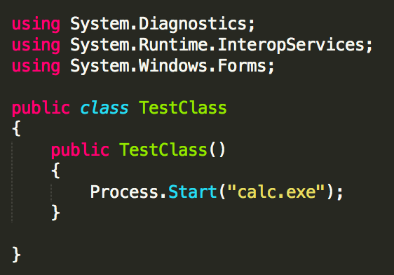 If we use James Forshaw’s DotNetToJScript technique to deserialize a .NET assembly in VBScript/JScript, we can achieve shellcode execution via the ScriptControl object by passing the VBScript/JScript code to the AddCode() method. Since the ScriptControl object was instantiated remotely via Outlook’s CreateObject() method, any code passed will be executed on the remote host. To demonstrate this, I will use a simple assembly that starts calc. The PoC C# looks something like this: