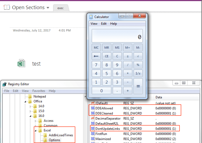 So, despite blocking DDE in Excel via “DDEAllowed”, the functionality is still there when accessed through OneNote. After chatting with Will Dormann, the only working mitigation is to set “DisableEmbeddedFiles” to 1. This obviously kills all file embedding functionality as a side-effect, which isn’t great for usability.