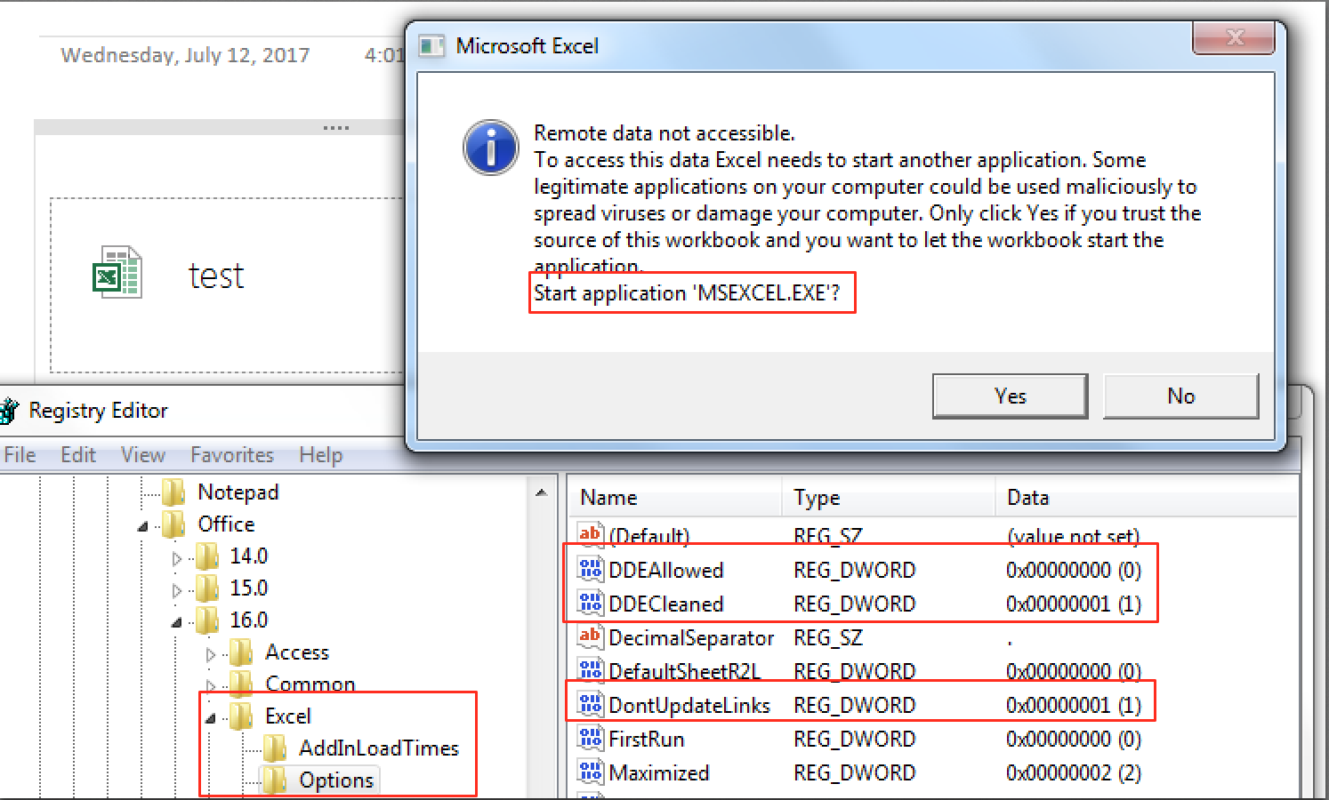 When implementing Will’s Excel registry change (specifically “DDEAllowed” set to DWORD 0), you will see something like this when opening a spreadsheet that contains a DDE formula: