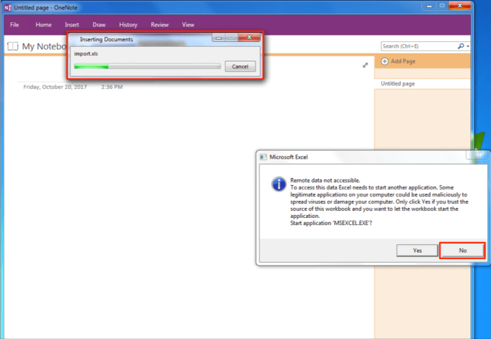 OneNote will then import the spreadsheet and during that process, it will attempt to execute your DDE command. To prevent that, simply click “No”
