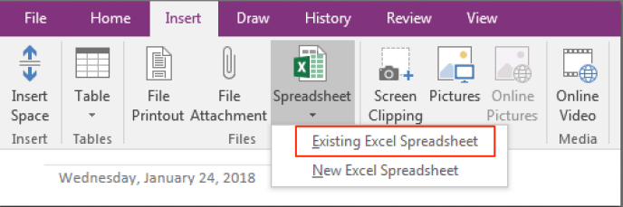 So, the Excel DDE block is working as expected. Now, let’s look at OneNote. In order to utilize the Excel functionality in OneNote, you can go to “SpreadSheet” under the “Files” tab and either import an existing Excel Spreadsheet or create a new one.