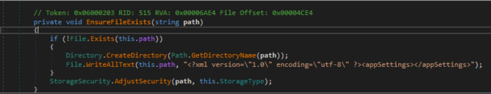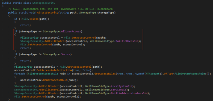 If the configuration file doesn’t exist, the service will create it and continue. If it does, it simply continues to the “StorageSecurity.AdjustSecurity()” function. In the case of the shared vs private configuration profiles, the “StorageType” being passed is either “AllUserAccess” or “Secure”. The “private” VPN profile is assigned the “Secure” storage type while the shared profile is assigned “AllUserAccess”.