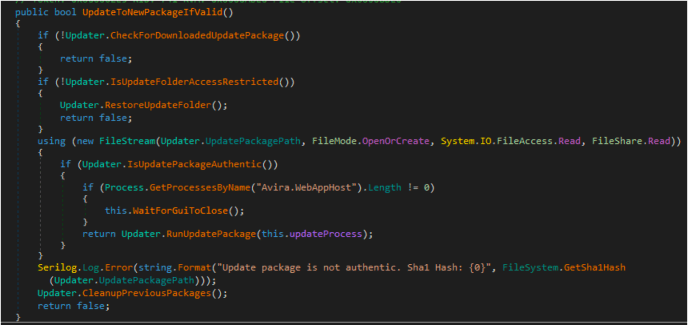 Upon entering “Updater.UpdateToNewPackageifValid()”, the service first checks if there is an update that is downloaded via a call to “Updater.CheckForDownloadedUpdatePackage()”. In order to do this, it checks for the existence of “C:\ProgramData\Avira\VPN\Update\AviraVPNInstaller.exe” and if the update file has already been installed or not: