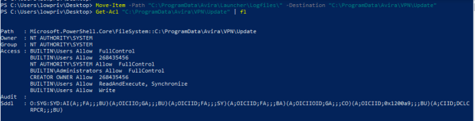 To abuse this, we can copy our version of “AviraVPNInstaller.exe” (and dependencies) to “C:\ProgramData\Avira\Launcher\LogFiles”, which is owned by SYSTEM yet writable by low privileged users: