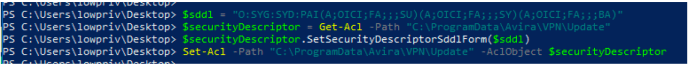 - The ability to plant this renamed executable, along with a malicious copy of VERSION.dll, in C:\ProgramData\Avira\VPN\Update via circumventing the folder Owner and DACL checks