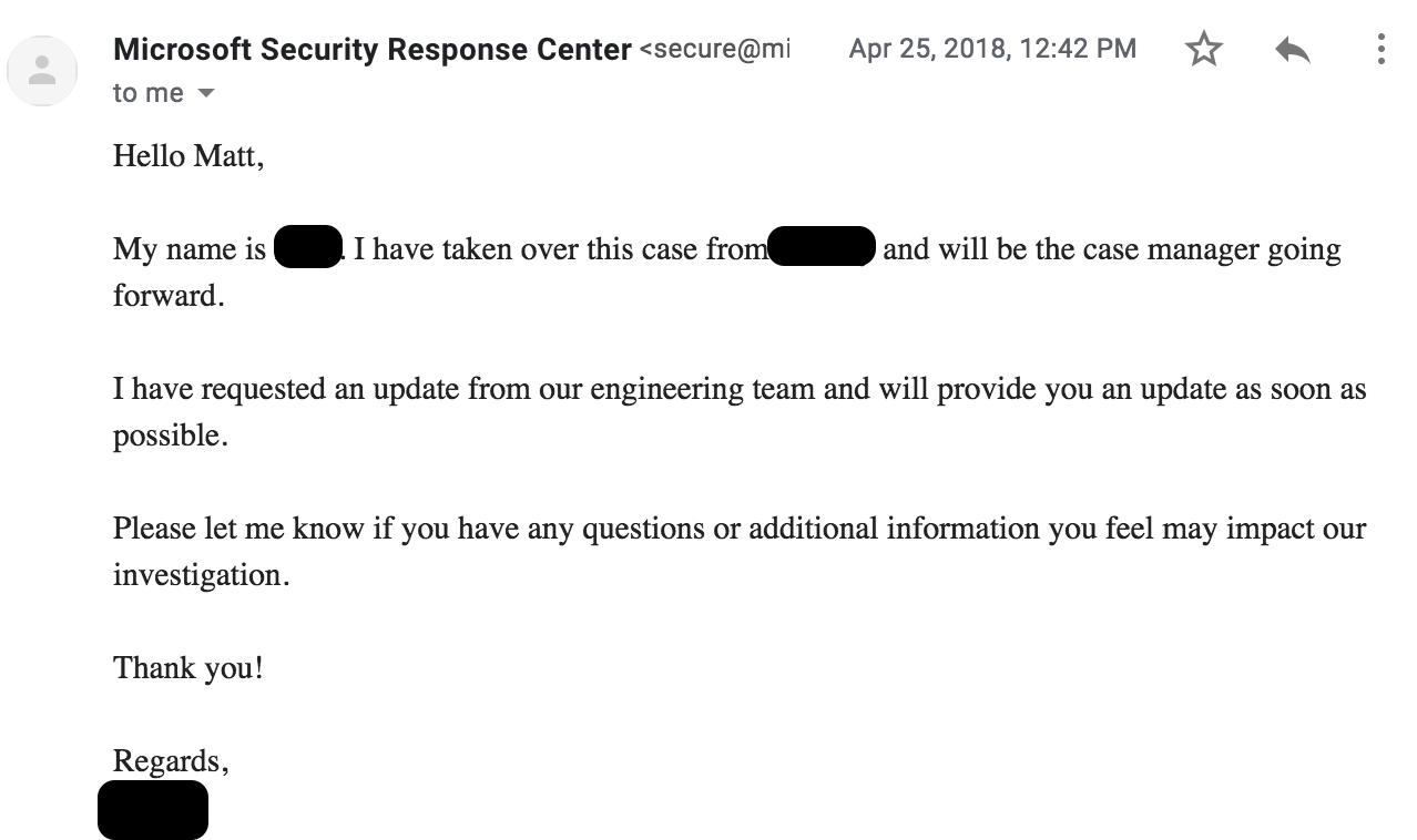 That same day, MSRC informed me that the additional details would be passed along to the team: