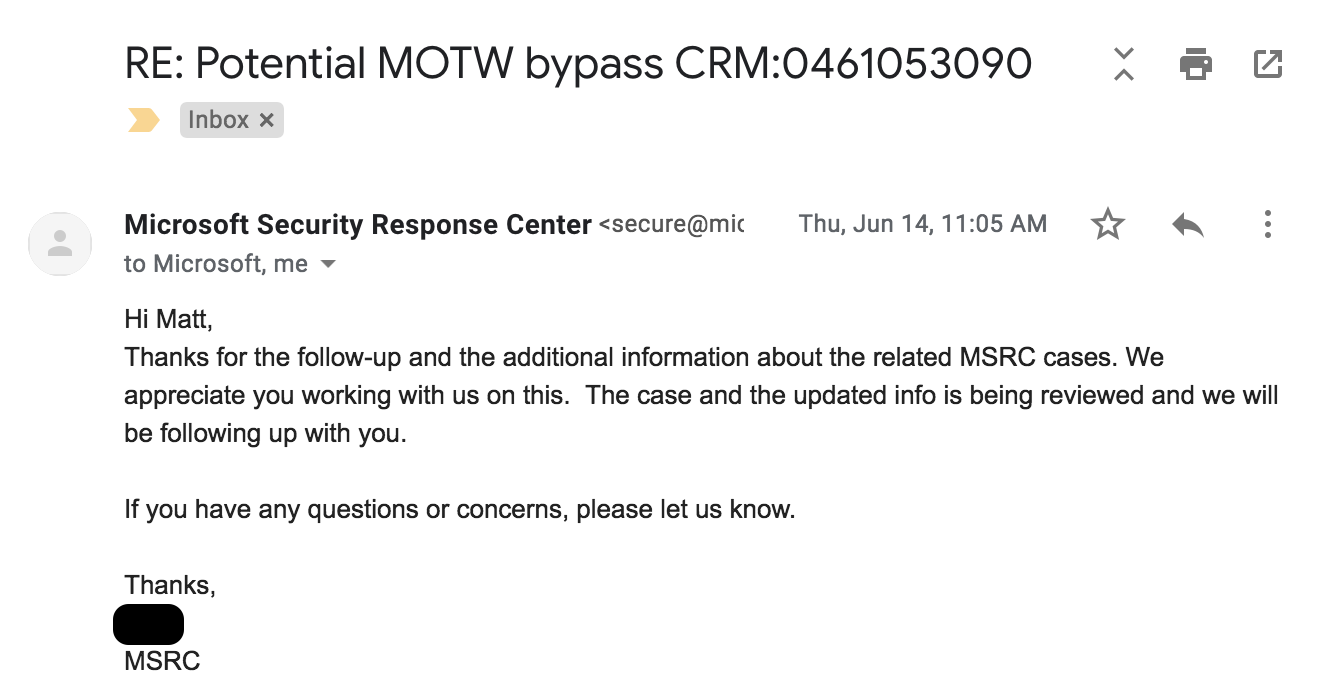 At this point, I saw two exploits impacting Google Chrome and Mozilla FireFox that utilized the .SettingContent-ms file format. After resending details, I got an email on June 14, 2018 at 11:05am, in which MSRC informed me the case would be updated: