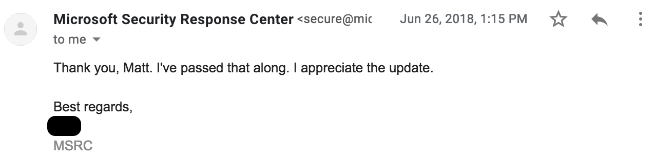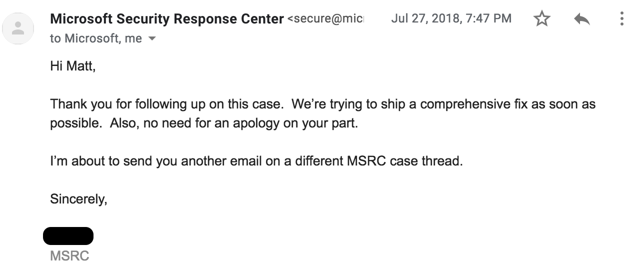 MSRC quickly let me know that they are going to ship a fix as quickly as possible…which is a complete 180 compared to the original report assessment: