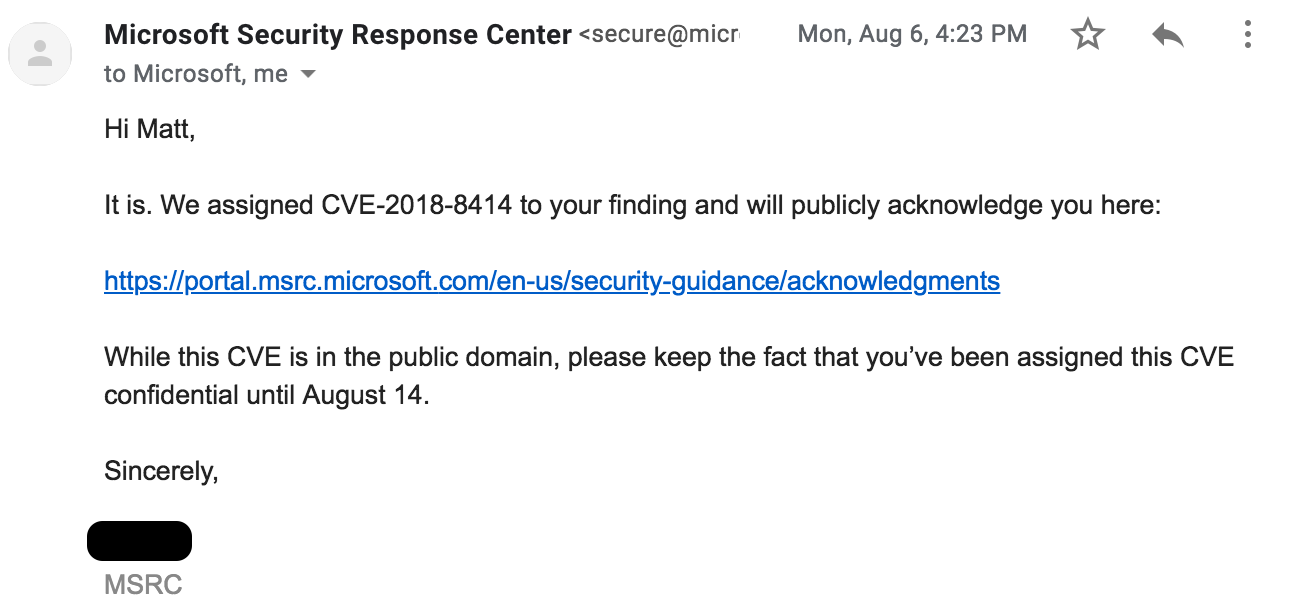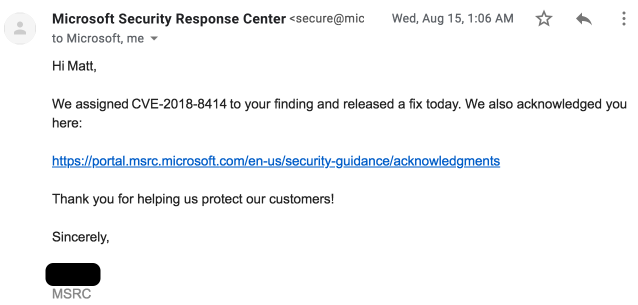 At this point, my jaw was on the floor. After sending some additional information to a closed MSRC case, the bug went from a “won’t fix” to “we are going to ship a fix as quickly as possible, and award you a bounty, too”. After some minor logistic exchanges with the Microsoft Bounty team, I saw that CVE-2018-8414 landed a spot on cve.mitre.org. This was incredibly interesting given less than a month ago, the issue was sitting as a “won’t fix”. So, I asked MSRC about it: