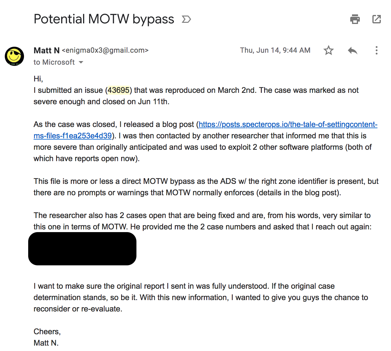 Given that response, I went ahead and blogged about it on July 11, 2018. After I dropped the post, I was contacted pretty quickly by another researcher on Twitter letting me know that my blog post resulted in 0days in Chrome and Firefox due to Mark-of-the-Web (MOTW) implications on the .SettingContent-ms file format. Given this new information, I sent a fresh email to MSRC on June 14, 2018 at 9:44am: