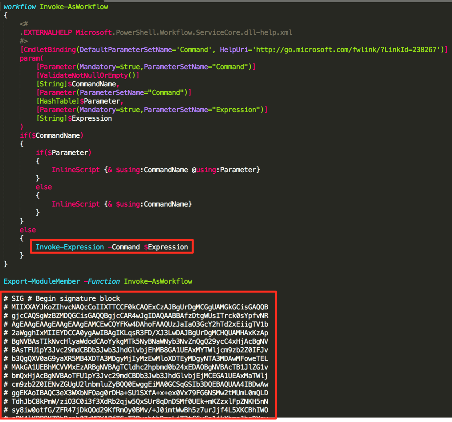 Another viable mitigation for blocking the old, vulnerable version is to note that the embedded signature is not Windows-signed (i.e. has the Windows System Component Verification EKU – 1.3.6.1.4.1.311.10.3.6). Device Guard CI policies permit limiting a publisher rule by a specific enhanced key usage (EKU). A stricter policy would allow only Windows-signed code to run – a rule that’s present in Matt Graeber’s Device Guard base reference policy. If only Windows-signed code is permitted to execute, the vulnerable version of Invoke-AsWorkflow would be limited to execution within constrained language mode, effectively mitigating the previous vulnerability. Now, vulnerable code can and will be Windows-signed but in this case, this vulnerability is effectively mitigated with a stronger Device Guard CI policy.